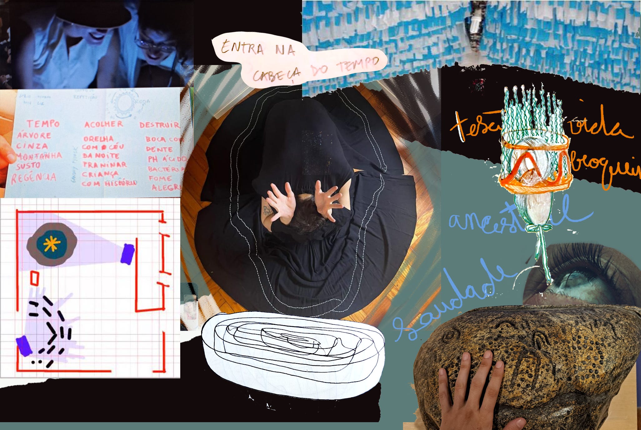 em segundo lugar, procuro que esse espaço de escrita seja alimento para - e digestão da - pesquisa "acolher destruir o tempo" - uma coisa meio antropófaga de si. essa pesquisa comecei em parceria com francisco rio em 2023 e está imbrincada em quase tudo que tenho feito artisticamente. começamos de uma vontade mútua de brincar junto e, vejo hoje, também de uma vontade de se apoiar para nos recuperar de algumas marcas que a pandemia deixou na gente. diferentes em cada ume, mas que de alguma forma ressoavam. dá pra ver mais sobre esse caminho nas edições anteriores.